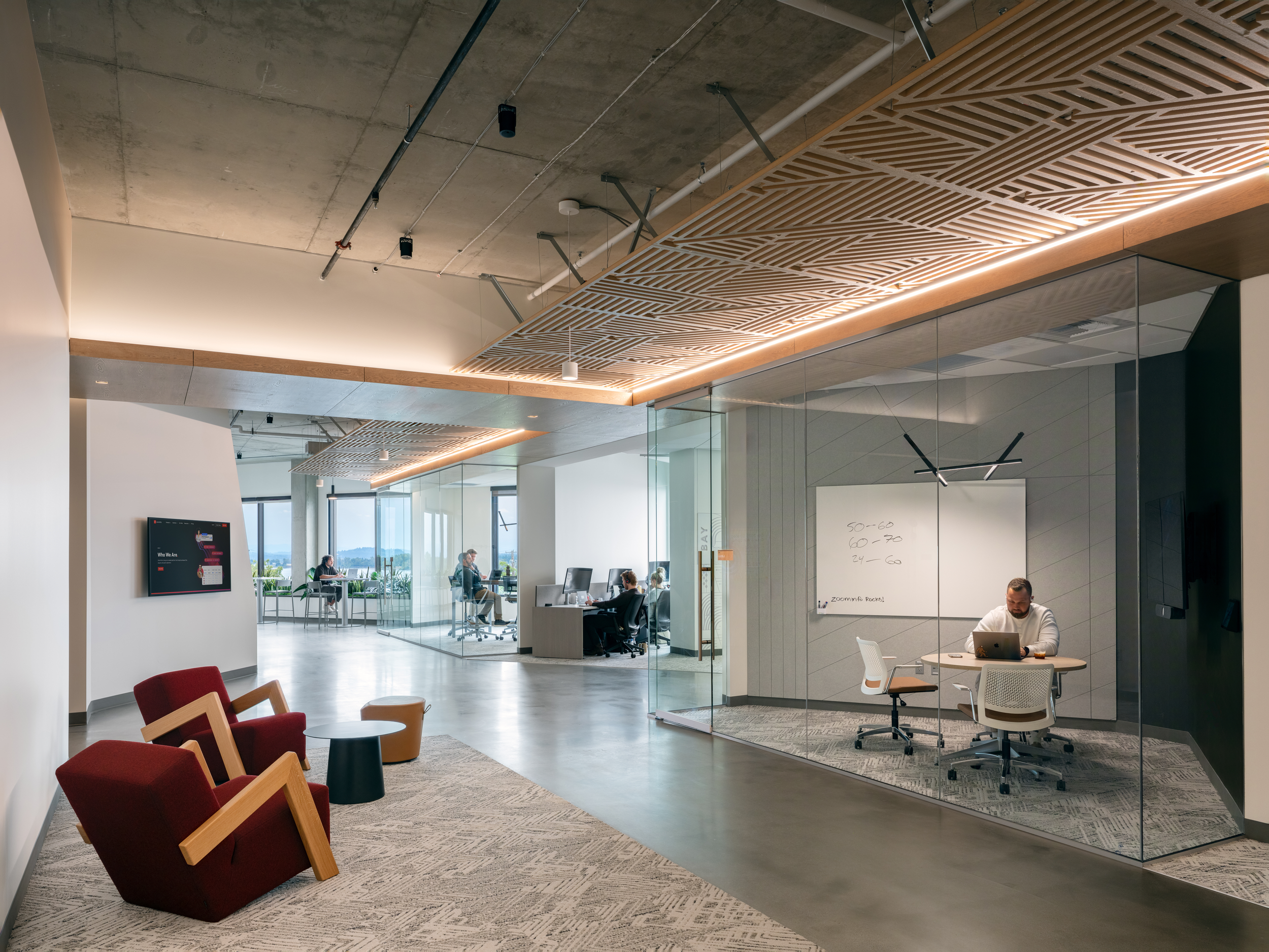 Efficient workstations and collaborative zones that align with the architect’s “central spine” concept of conference and huddle spaces running the length of each floor.