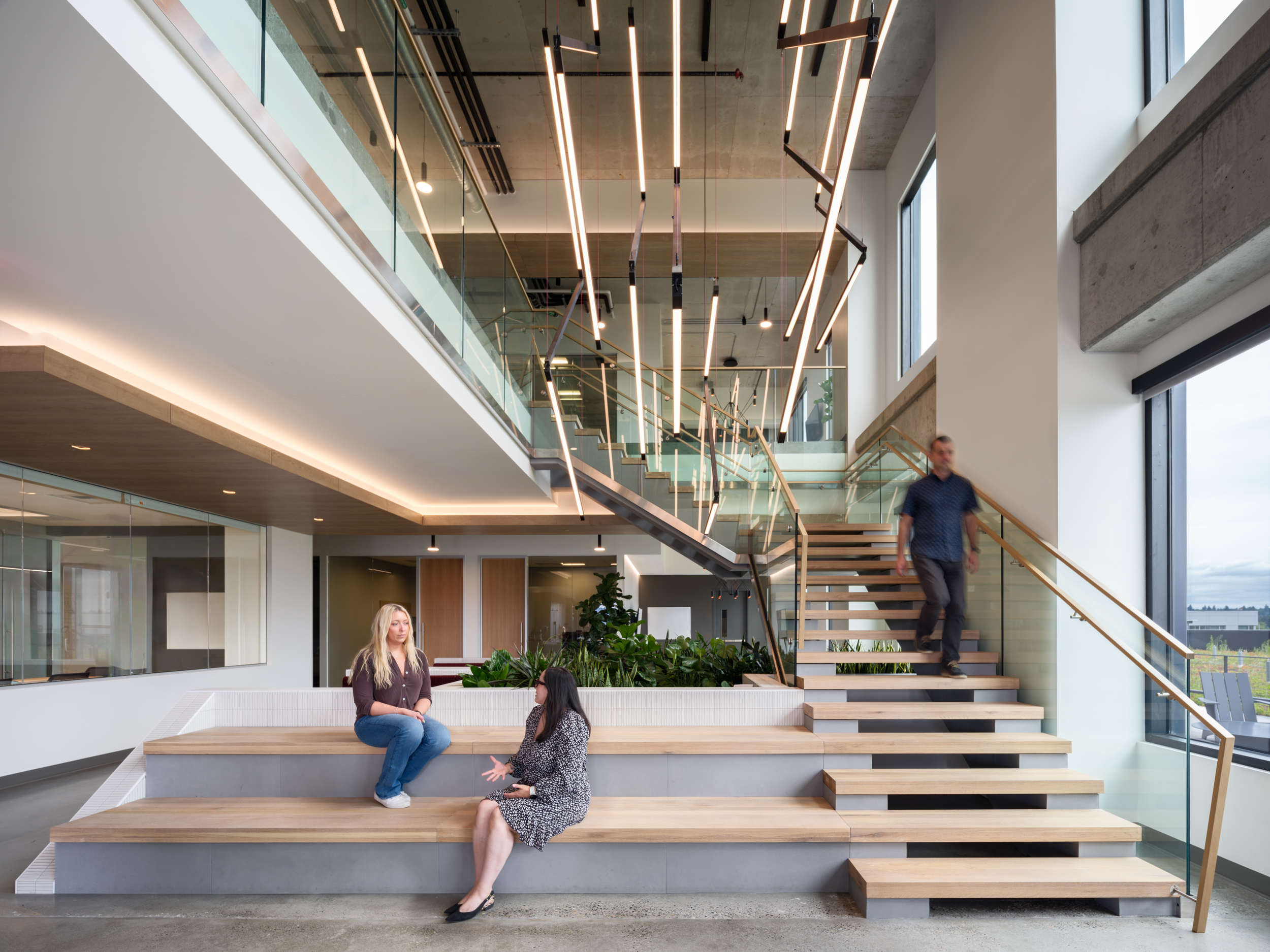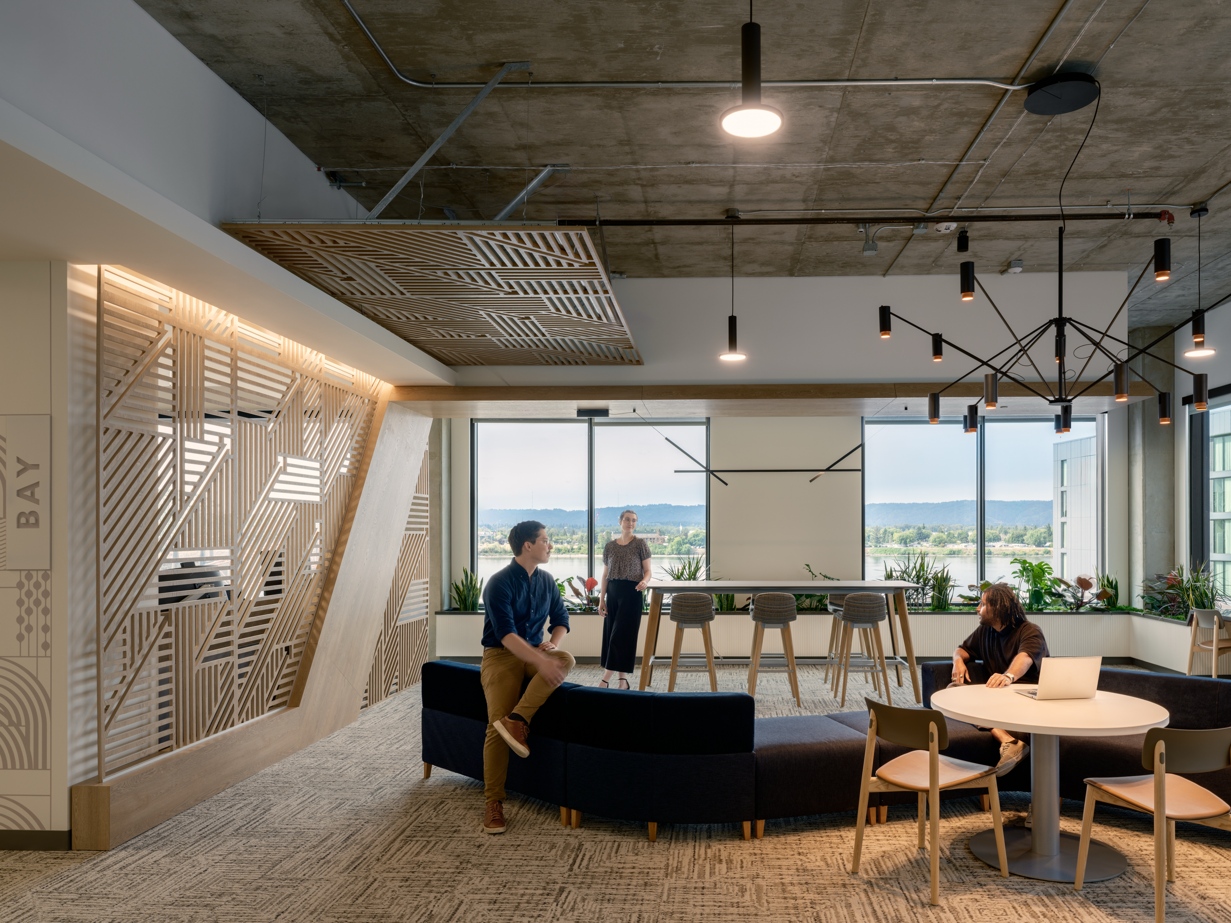 As one of the Pacific Northwest’s most prominent technology success stories, ZoomInfo has experienced rapid growth over the past several years—expanding from a regional startup to an international, publicly traded company. To support this evolution, ZoomInfo envisioned a world-class headquarters that would reflect its maturity as a brand while accommodating future expansion. Located along Vancouver’s revitalized Terminal 1 waterfront, the new 150,000 SF workspace blends sophisticated design with workplace performance, achieving a balance between visual refinement and everyday functionality.